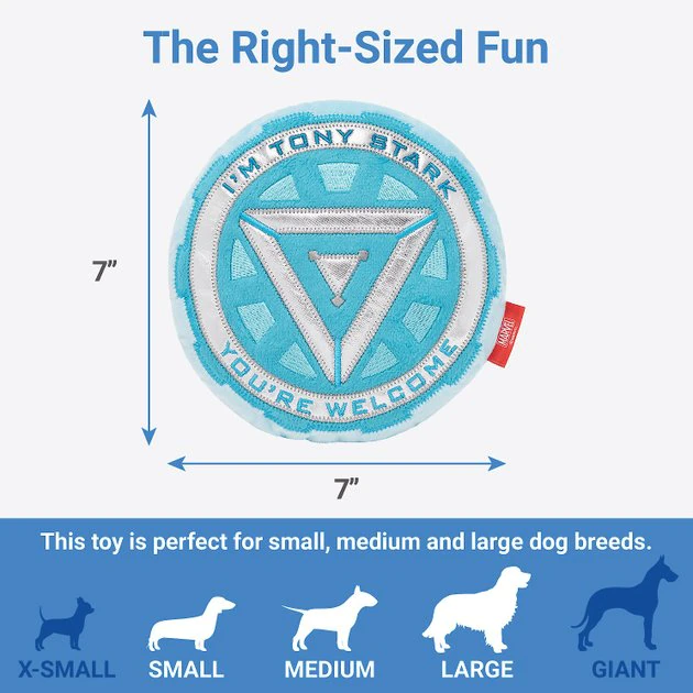Make a Marvel fan’s day with the round Iron Man Arc Reactor plush, available only at Chewy! This round plush has a soft and cuddly cover, super plush stuffing dogs can’t resist chomping on and a squeaker inside to keep your furry sidekick engaged in all the fun and games. Whether it’s time for interactive play like fetch or catch, or your pup just needs a good cuddle buddy, this accessory from your pup’s favorite Marvel hero is up to the task!