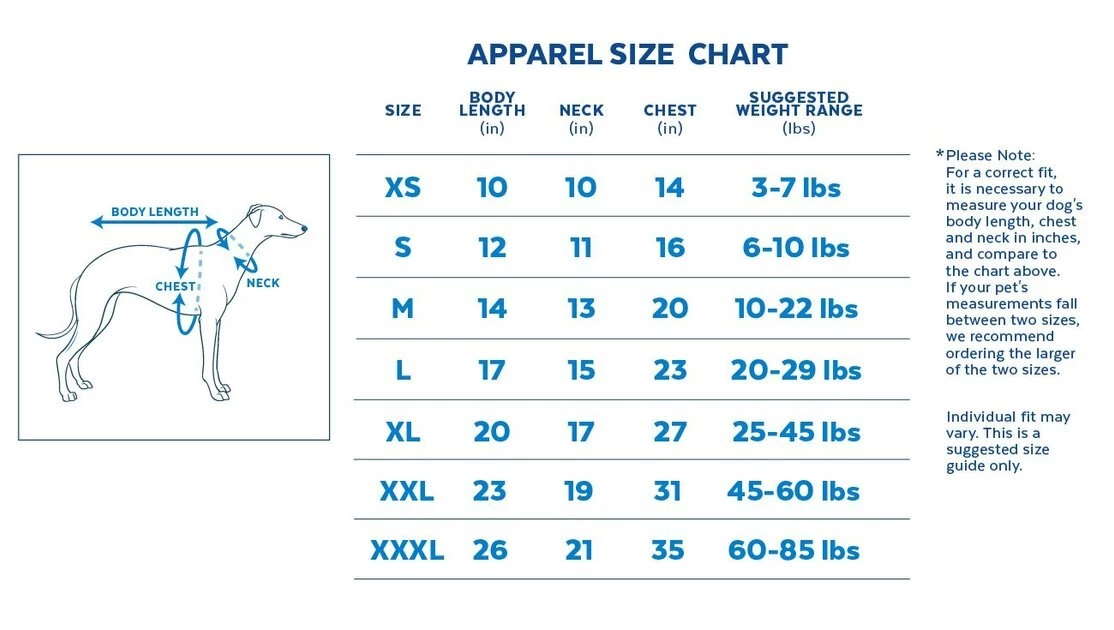 | Size | Body Length | Neck | Chest | Suggested Weight Range |