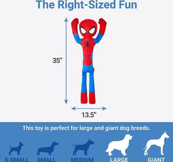 - Extra-long Spider-Man dog plush features paw-lenty of crinkle paper and multiple squeakers for wacky, floppy and fun play.