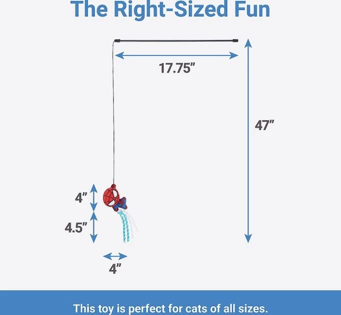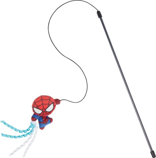 - Cat toy features a wand with a catnip- and crinkle paper-stuffed stuffed Spider-Man toy with curly strings and ribbons attached.