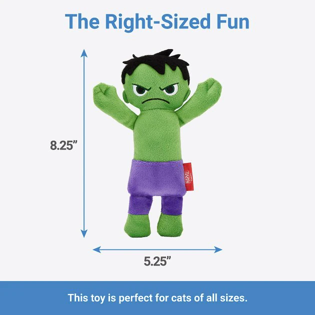 - Plush, kicker-style The Hulk toy is designed for cats who love to play a little rough with their toys.