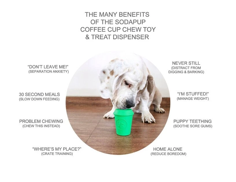 Help your best friend start every day right with the SodaPup Coffee Cup Rubber Treat Dispenser Dog Toy. This fun treat dispenser and chew toy offers stimulation and enrichment when you stuff it with treats or food. Built tough to withstand even powerful chewing, it is made from natural rubber that is FDA-compliant, biodegradable, and non-toxic. Fill it with treats, kibble, peanut butter, canned food, or your dog’s favorite snack—and watch as he enjoys a special coffee break!