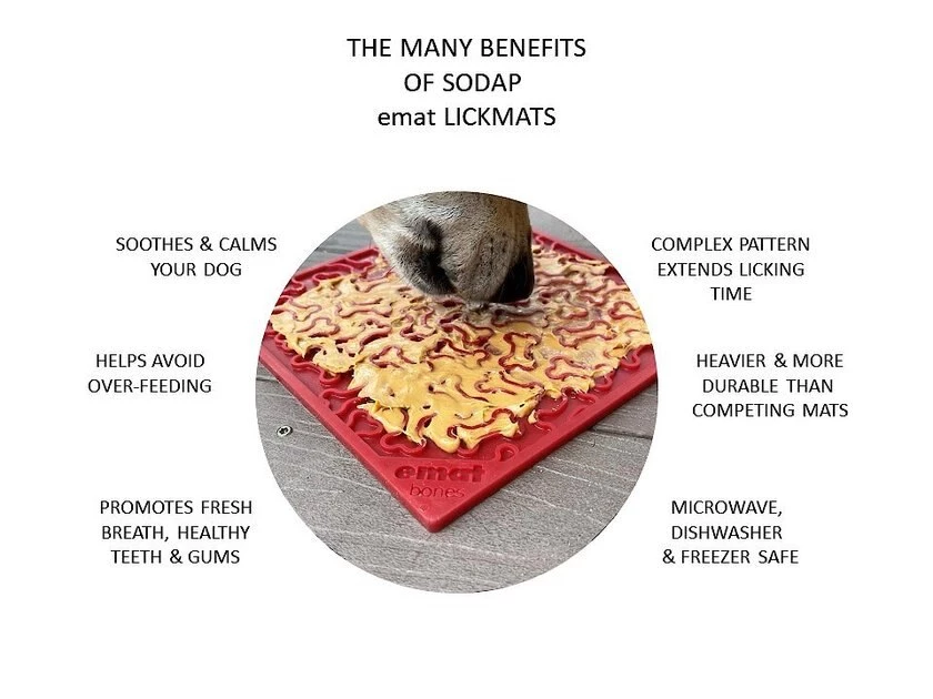 Make your dog feel happiness right down to his bones with the SodaPup Emat Bones Dog Toy. Lick mats are beloved by multitudes of canines, and they can provide long-lasting engagement and satisfaction. Simply smooth this lick mat with soft, spreadable treats or wet food and serve, or you can freeze the filled mat before serving for longer-lasting enjoyment. Licking helps release relaxing hormones that soothe your dog, and the activity of getting the food out can distract your dog from stress and ease boredom. It also produces saliva to aid digestion and promote dental health. This mat is USA-made, non-toxic and top-rack dishwasher safe—and it is sure to be a hit with your furry friend!