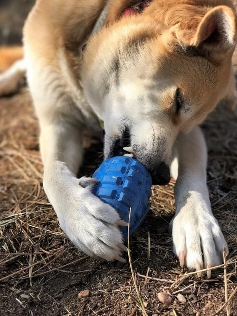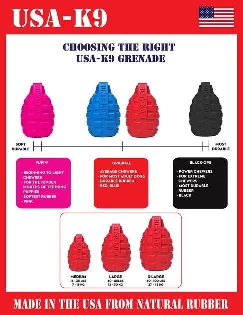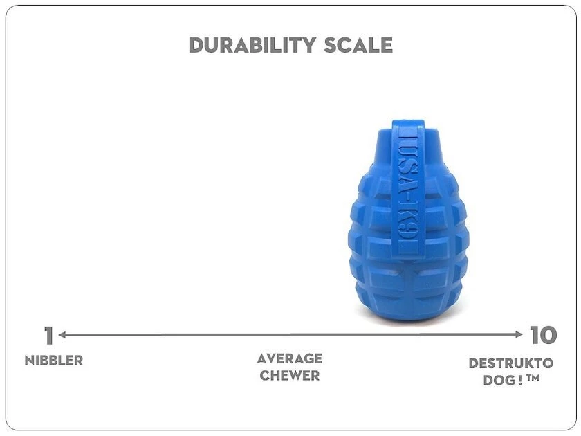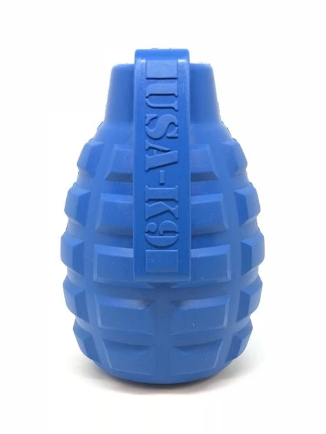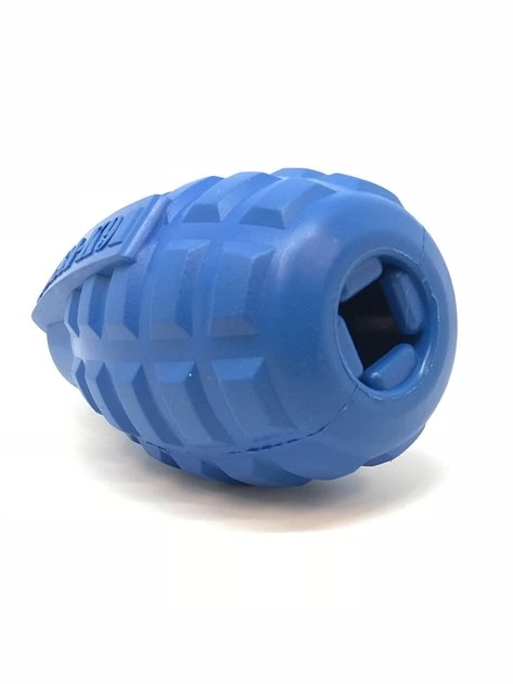 Fuel hours of explosive canine play with the SodaPup Grenade Rubber Treat Dispenser Dog Toy. This durable chew toy and treat dispenser provides a great way to entertain your pup, and its’ fun grenade shape makes it easy to spot at the dog park. Fill it with kibble and use it as a slow feeder or put tasty snacks inside—your dog will love the exciting process of working to get his reward. This natural rubber toy is USA-made, FDA-compliant, biodegradable, and non-toxic so it’s good for you, your dog—and the planet, too!