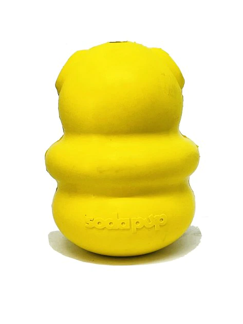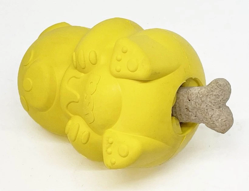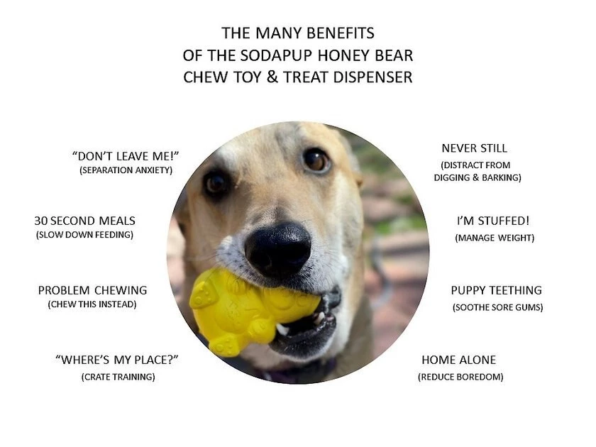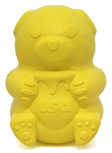 Give your best friend a sweet reward with the SodaPup Honey Bear Rubber Treat Dispenser Dog Toy. This durable chew toy and treat dispenser provides a great way to entertain your pup, and its honey bear shape is simply adorable. Fill it with kibble and use it as a slow feeder or put tasty snacks inside—your dog will love the exciting process of working to get his reward. A toothed opening helps hold the treats in and makes getting them more challenging. This natural rubber toy is USA-made, FDA-compliant, biodegradable, and non-toxic so it’s good for you, your dog—and the planet, too!