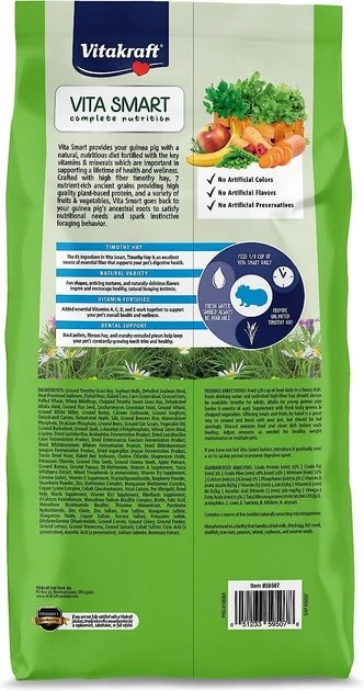 Vitakraft VitaSmart Guinea Pig Food, 8-lb bag—Help keep your guinea pig happy and healthy with this Vitakraft VitaSmart Guinea Pig Food. This natural, nutritious and delicious recipe is formulated with essential vitamins and minerals to support overall health, high-fiber timothy hay, 7 nutrient-rich ancient grains for premium plant-based protein, plus fruits and veggies. This food was created with your furry friend’s ancestral roots in mind and promotes your little one’s natural foraging behavior to help keep her thriving!