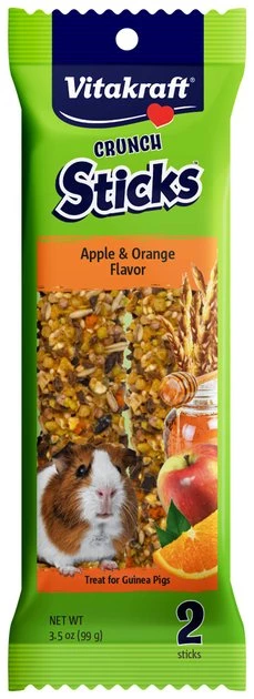 Treat your furry friend to a flavorful chewing experience with Vitakraft Crunch Sticks Apple & Orange Flavor Guinea Pig Treat! Featuring delicious apple and orange flavors, each of these chewtastic sticks are baked three times on an all-natural wooden stick—so your pal can enjoy the sweet taste as he partakes in hours of chewing fun. They support his dental health too, as their crunchy texture shaves down his teeth. Stimulating his natural foraging behaviors is easy with these tasty treats, so your fur baby will feel like he is in his natural habitat each time you serve them! Plus, they are enriched with plenty of essential vitamins and minerals—meaning they are an ideal supplement for your guinea pig’s everyday diet.