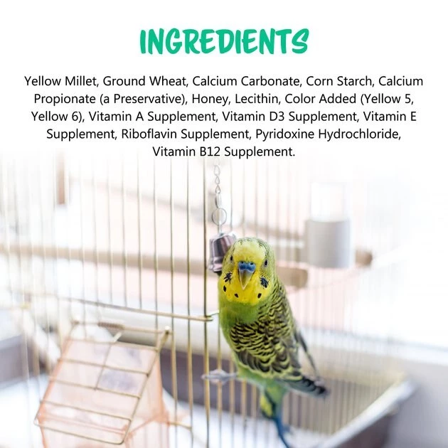 Yellow Millet, Ground Wheat, Calcium Carbonate, Corn Starch, Calcium Propionate (a Preservative), Honey, Lecithin, Color Added (Yellow 5, Yellow 6), Vitamin A Supplement, Vitamin D3 Supplement, Vitamin E Supplement, Riboflavin Supplement, Pyridoxine Hydrochloride, Vitamin B12 Supplement.