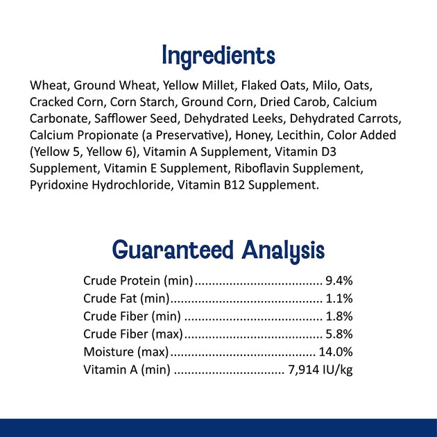Wheat, Ground Wheat, Yellow Millet, Flaked Oats, Milo, Oats, Cracked Corn, Corn Starch, Ground Corn, Dried Carob, Calcium Carbonate, Safflower Seed, Dehydrated Leeks, Dehydrated Carrots, Calcium Propionate (A Preservative), Honey, Lecithin, Color Added (Yellow 5, Yellow 6), Vitamin A Supplement, Vitamin D3 Supplement, Vitamin E Supplement, Riboflavin Supplement, Pyridoxine Hydrochloride, Vitamin B12 Supplement.