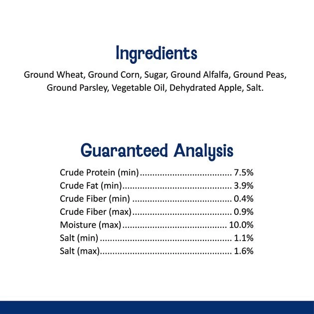 Ground Wheat, Ground Corn, Sugar, Ground Alfalfa, Ground Peas, Ground Parsley, Vegetable Oil, Dehydrated Apple, Salt.