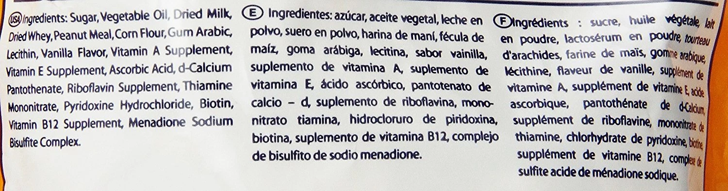 Sugar, Vegetable Oil, Dried Milk, Dried Whey, Peanut Meal, Corn Flour, Gum Arabic, Lecithin, Vanilla Flavor, Vitamin A Supplement, Vitamin B Supplement, Vitamin E Supplement, Ascorbic, D-Calcium Pantothenate, Riboflavin Supplement, Thiamine Mononitrate, Pyridoxine Hydrochloride, Biotin, Vitamin B12 Supplement, Menadione Sodium Bisulfite Complex.