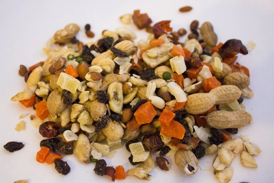 - Tropical fruits are mixed with whole peanuts, peas, carrots, and chili peppers for exciting variety!