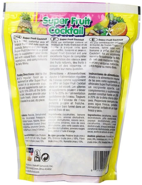 Pique your bird’s interest with Vitakraft Fresh Super Fruit Cocktail Fruit Blend Parrot & Parakeet Treats. These treats make a satisfying supplement to your pet bird’s regular diet. Each bite features an irresistible mix of tropical fruits and vegetables with novel add-ins like whole peanuts and chili peppers. Great for cockatiels, conures, parakeets and parrots alike, your buddy will flap with joy for these fun and interesting treats!