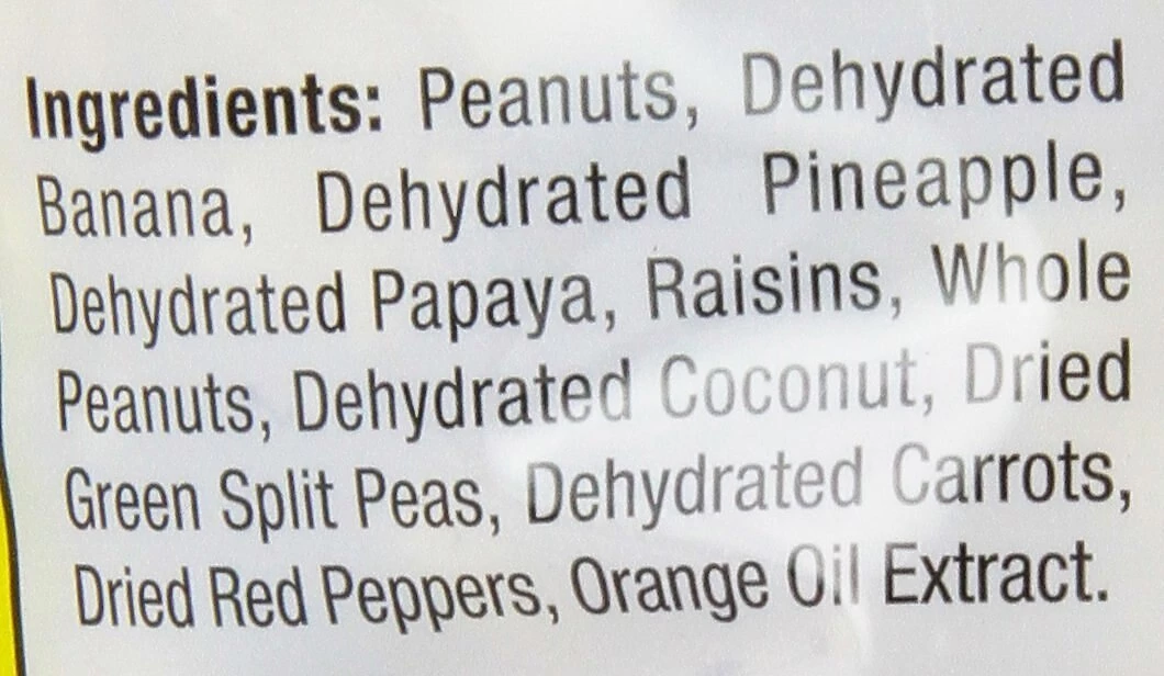 Peanuts, Dehydrated Banana, Dehydrated Pineapple, Dehydrated Papaya, Raisins, Whole Peanuts, Dehydrated Coconut, Dried Green Split Peas, Dehydrated Carrots, Dried Red Peppers, Orange Oil Extract.