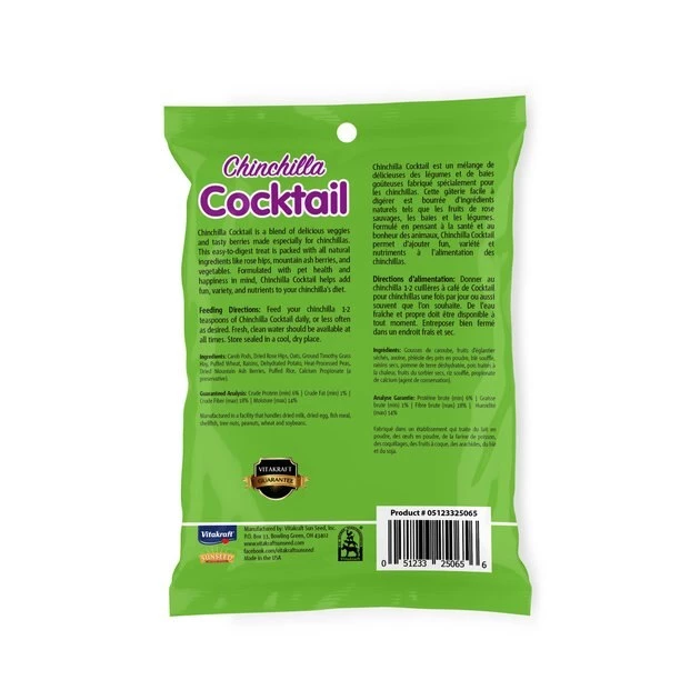 Feed your Chinchilla treat that mimics food in his natural habitat with Vitakraft Fruit Cocktail Chinchilla Treats. Treats are a great way to bond with your pet, add variety to their daily diet and encourage natural foraging behavior. Vitakraft Chinchilla Cocktail is a colorful mixture of delicious, all-natural flowers and berries Chins would find in the wild including carob pods, rosehips, alfalfa and raisins. It is easy to digest and makes an ideal daily treat.