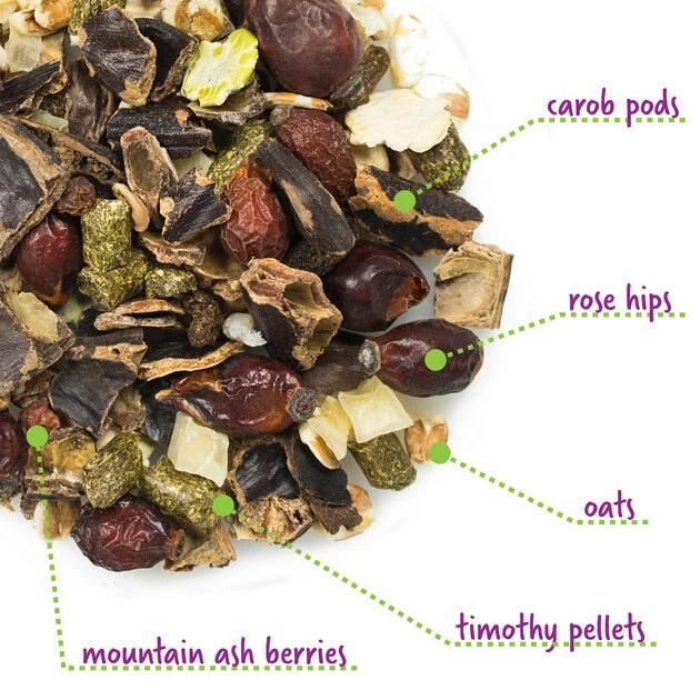 Carob Pods, Dried Rose Hips, Dehydrated Alfalfa Meal, Puffed Wheat, Raisins, Ground Corn, Oats, Dehydrated Potato, Heat-Processed Peas, Dried Mountain Ash Berries, Puffed Rice, Wheat Middlings, Vegetable Oil, Calcium Propionate (A Preservative).