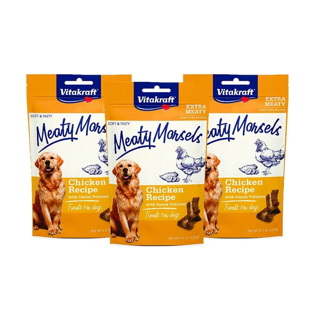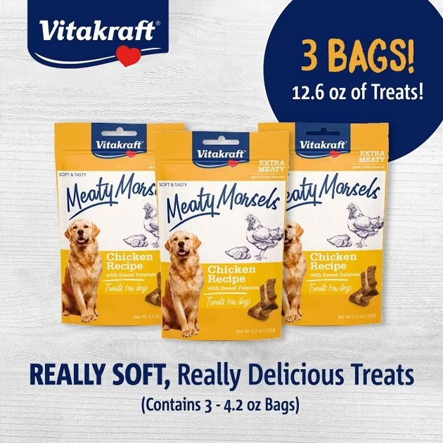 Vitakraft Chicken with Potato Meaty Morsels are the paw-fect way to spoil your canine companion! Prepared in small batches, these tasty bites are oven roasted to create a dog-approved texture and flavor. They’re made without added sugar, artificial colors or flavors— giving pet parents peace of mind. As a convenient bonus, the treats also make a super yummy hiding spot for your pet’s pills. When it comes to enticing snacks, nothing’s better than soft chewy Meaty Morsels!