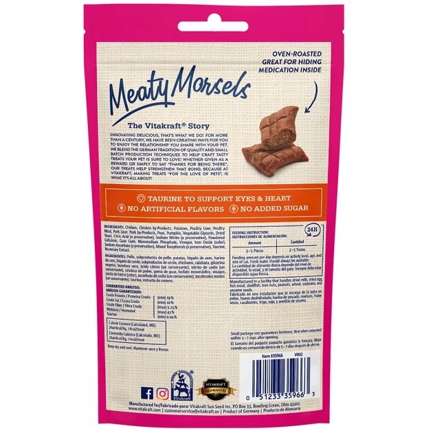 Your favorite feline will pounce with joy when you give her Vitakraft Meaty Morsels Chicken with Pumpkin Recipe Soft Cat Treats! These chicken and pumpkin flavored cat treats are moist, tender, and over 70% meat—your purr-fect indoor pet will love sinking her teeth into the meaty double layers and savory center. Plus, these treats can double as pill pockets when your kitty needs to take her medicine. The soft texture makes them easy to chew—ideal for mature cats. Truly the indulgent treat your classy cat deserves!