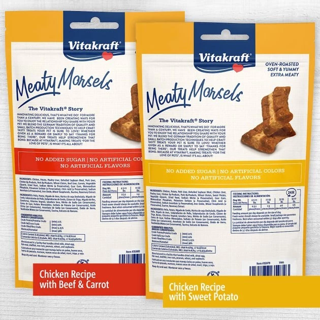 Boring normal treats aren’t good enough for your fur-ever friend—give them a Vitakraft Chicken with Sweet Potato Meaty Morsel instead! Oven roasted to paw-fection, they feature a soft, chewy texture that’s sure to please you pup. Their super meaty flavor makes them great for hiding icky meds and supplements. Picky pet parents will also love that the treats are free of added sugar, as well as artificial colors and flavors. Your playmate is sure to feel appreciated when you reward them with a Vitakraft Meat Morsel!