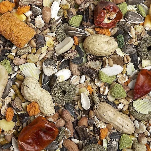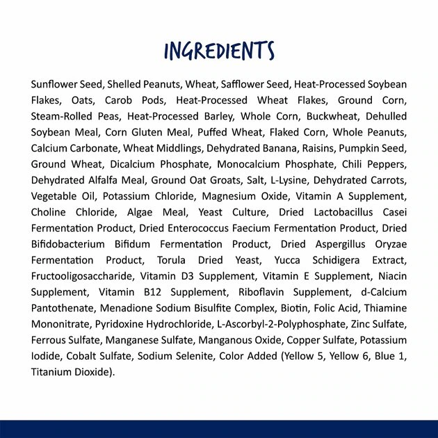Sunflower Seed, Shelled Peanuts, Wheat, Safflower Seed, Heat-Processed Soybean Flakes, Oats, Carob Pods, Heat-Processed Wheat Flakes, Ground Corn, Steam-Rolled Peas, Heat-Processed Barley, Whole Corn, Buckwheat, Dehulled Soybean Meal, Corn Gluten Meal, Puffed Wheat, Flaked Corn, Whole Peanuts, Calcium Carbonate, Wheat Middlings, Dehydrated Banana, Raisins, Pumpkin Seed, Ground Wheat, Dicalcium Phosphate, Monocalcium Phosphate, Chili Peppers, Dehydrated Alfalfa Meal, Ground Oat Groats, Salt, L-Lysine, Dehydrated Carrots, Vegetable Oil, Potassium Chloride, Magnesium Oxide, Vitamin A Supplement, Choline Chloride, Algae Meal, Yeast Culture, Dried Lactobacillus Casei Fermentation Product, Dried Enterococcus Faecium Fermentation Product, Dried Bifidobacterium Bifidum Fermentation Product, Dried Aspergillus Oryzae Fermentation Product, Torula Dried Yeast, Yucca Schidigera Extract, Fructooligosaccharide, Vitamin D3 Supplement, Vitamin E Supplement, Niacin Supplement, Vitamin B12 Supplement, Riboflavin Supplement, D-Calcium Pantothenate, Menadione Sodium Bisulfite Complex, Biotin, Folic Acid, Thiamine Mononitrate, Pyridoxine Hydrochloride, L-Ascorbyl-2-Polyphosphate, Zinc Sulfate, Ferrous Sulfate, Manganese Sulfate, Manganous Oxide, Copper Sulfate, Potassium Iodide, Cobalt Sulfate, Sodium Selenite, Color Added (Yellow 5, Yellow 6, Blue 1, Titanium Dioxide).