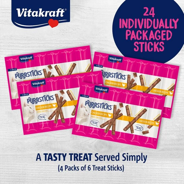 Keep your kitty purring all day long with Vitakraft PurrSticks Meaty Chicken Recipe Segmented & Breakable Deliciously Tender Cat Treats! These savory snacks are segmented and pre-portioned for easy, guess-free treating. Each bite is loaded with premium ingredients including real chicken. Great for indoor games of catch or on-the-go snacking, PurrSticks are the paw-fect treat to satisfy your kitty’s hunger and your desire to give them the very best!