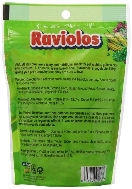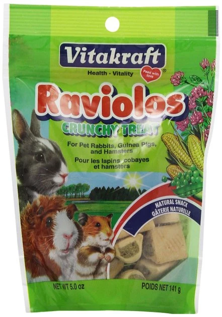 Add some variety to your fuzzy friend’s diet with Vitakraft Raviolos Made with Real Vegetables Rabbit, Guinea Pig & Hamster Small Animal Treats. These scrumptious snacks feature a crunchy, grain-based outer layer and yummy center stuffed with natural foraging ingredients like alfalfa hay and carrots. Great for treating guinea pigs, hamsters and rabbits alike.