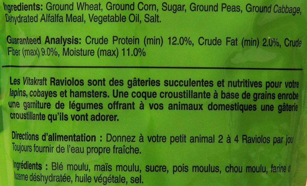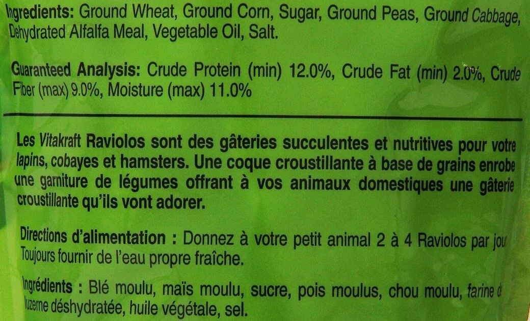 Ground Wheat, Ground Corn, Sugar, Ground Peas, Ground Cabbage, Dehydrated Alfalfa Meal, Vegetable Oil, Salt.