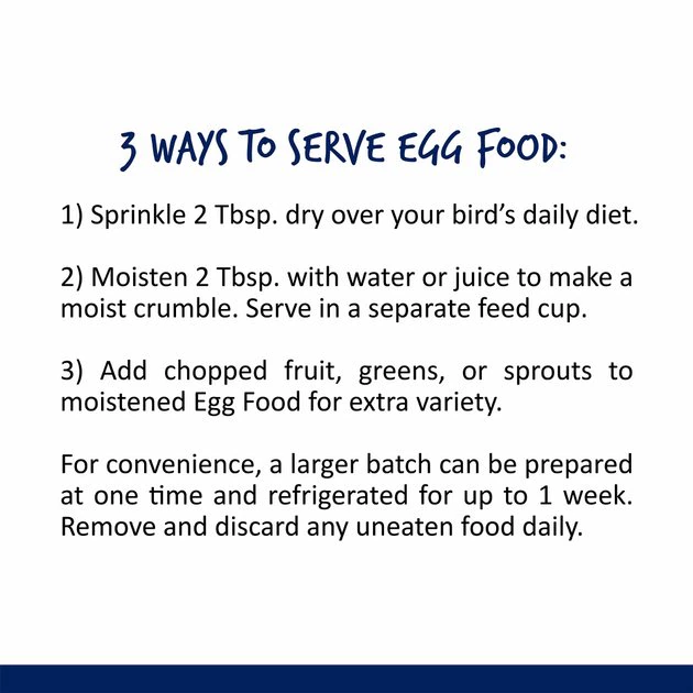 Vitakraft Egg Food can be served in three different ways: 1) Sprinkle 2 Tbsp. of dry Egg Food over your birds daily diet. 2) Moisten 2 Tbsp. of Egg Food with enough water or juice to make a moist crumble texture, and serve in a separate feed cup. 3) For extra variety, try combining chopped fruit, greens, or sprouts and seeds to moistened Egg Food. For convenience, a larger batch can be prepared at once and refrigerated for up to 1 week. Remove and discard any uneaten food daily. Fresh, clean water should be available at all times. Store in a cool, dry place.